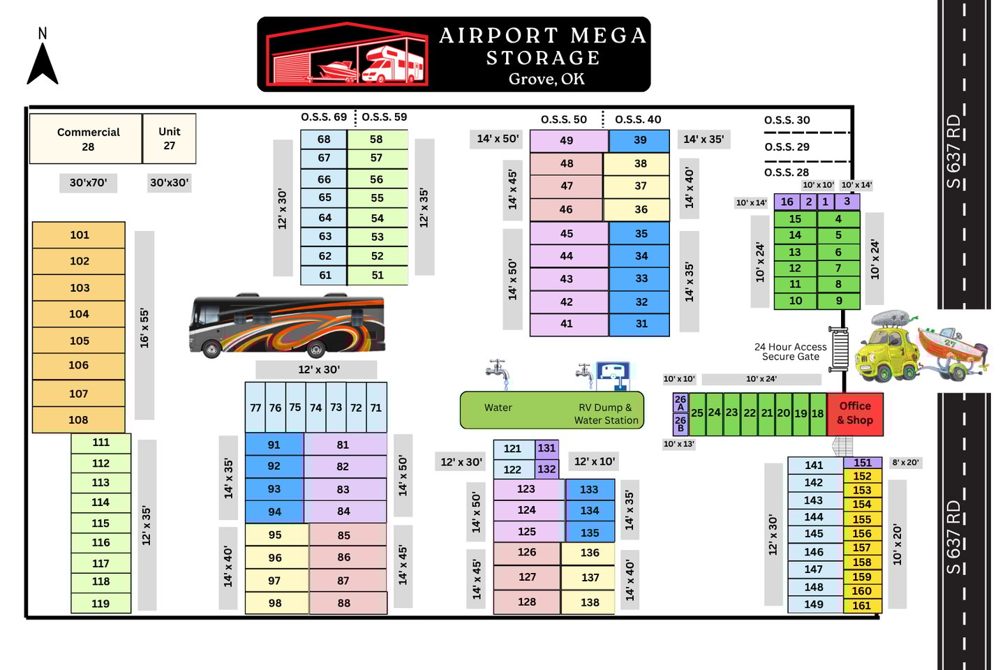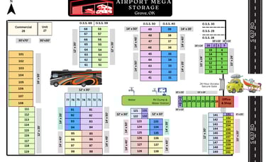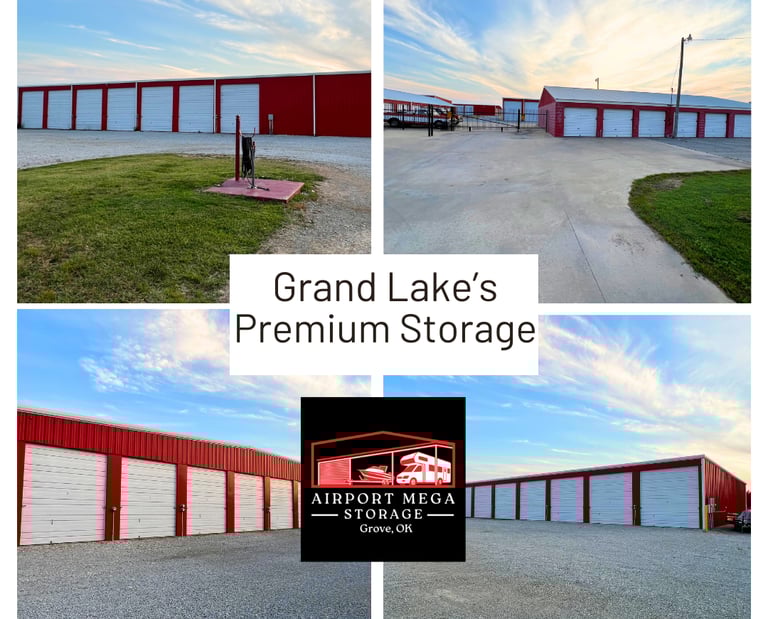 Welcome to Airport Mega Storage, Grand Lake Oklahoma's newest Indoor Storage facility conveniently located in Grove, OK. We offer exclusive indoor storage options for a wide range of vehicles, including RVs (large or small), Motorhomes, Trailers, 5th Wheels, Boats, Jet Ski's, Pontoons, Cars, Trucks, and even Heavy equipment. Whether you need a Mini Unit, Business Unit, or Outdoor Space, we have you covered.